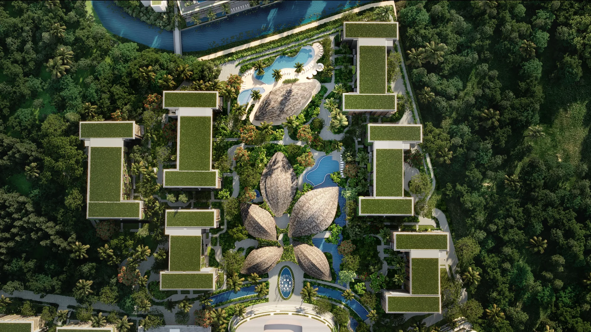 Privacy and natural aesthetics: green spaces, walking paths, and a resort-like atmosphere.